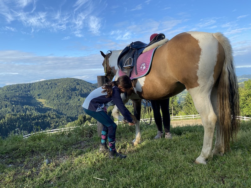 Die Pferde striegeln, für das Reiten vorbereiten, füttern, ausreiten oder allgemein die Technik am Reitplatz verbessern, dies alles gehört bei uns am Romnighof dazu!